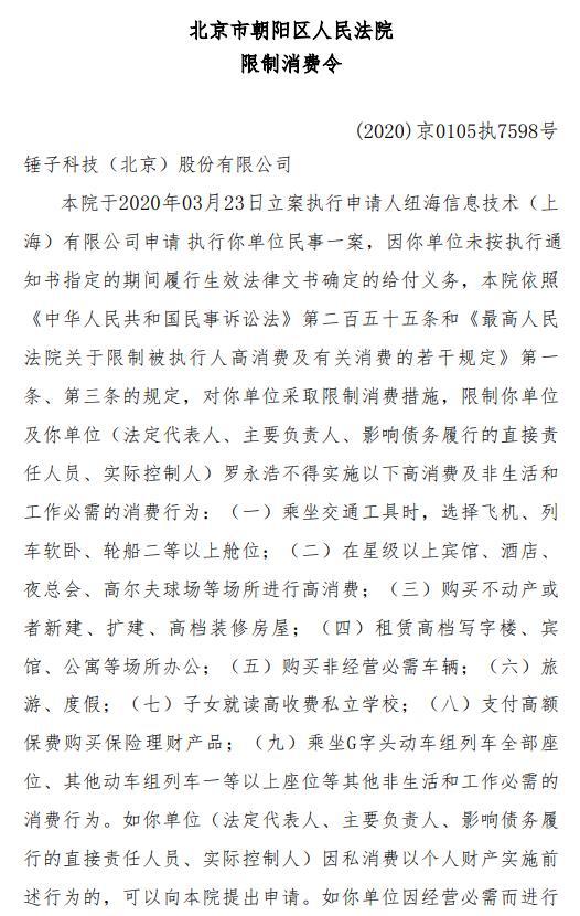约束消费令称,北京市朝阳区人民法院于2020年03月23日立案实行请求人纽海信息技术(上海)有限公司(下称“纽海信息”)请求实行锤子科技民事一案,因锤子科技未按实行通知书指定的期间实行收效法律文书确认的给付职责,北京市朝阳区人民法院按照《中华人民共和国民事诉讼法》第二百五十五条和《最高人民法院关于约束被实行人高消费及有关消费的若干规则》榜首条、第三条的规则,对锤子科技采纳约束消费方法,约束锤子科技及公司(法定代表人、首要负责人、影响债款实行的直接职责人员、实践操控人)罗永浩不得施行多项高消费及非日子和作业必需的消费行为。