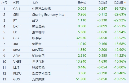 4月3日晚间,13只中概股隔夜收盘跌幅超越10%,这中心还包含3只跌幅超越20%。跌幅较大的股票除了部分仙股,也包含瑞幸咖啡、跟谁学、万国数据、世纪互联等曾遭做空的中概股。
