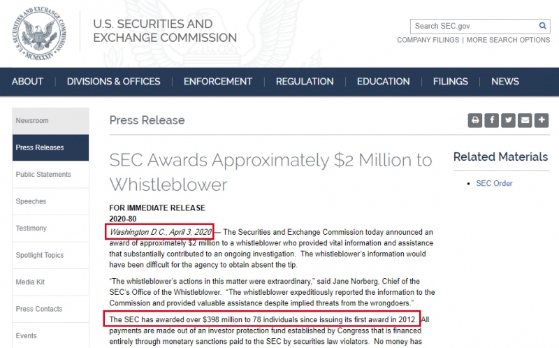 假如举报人自愿向美国证监会(SEC)供给原始、及时和牢靠的信息,然后导致法律举动成功,则举报人可能有资历取得奖赏。当钱银处分的金额超越100万美元时,举报人奖金的规模可能在钱银处分金额的10%到30%之间。有关「举报人」方案以及怎么陈述提示的更多信息,请拜访