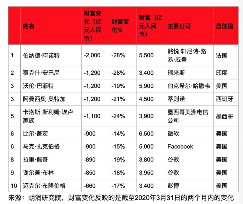 新京报讯(记者 陈鹏)疫情影响全球股市,部分企业家的财富也随之起浮。4月6日,胡润研讨院发布《疫情两个月后全球企业家财富改变特别陈述》,研讨了胡润全球富豪榜企业家在到3月31日的两个月内的财富改变,并发布最新的《胡润全球百强企业家》榜单。多个方面数据显现,全球百强企业家近两月财富丢失2.6万亿人民币,即13%,蒸发了曩昔两年半所发明的财富。其间,前十名丢失1.4万亿人民币。