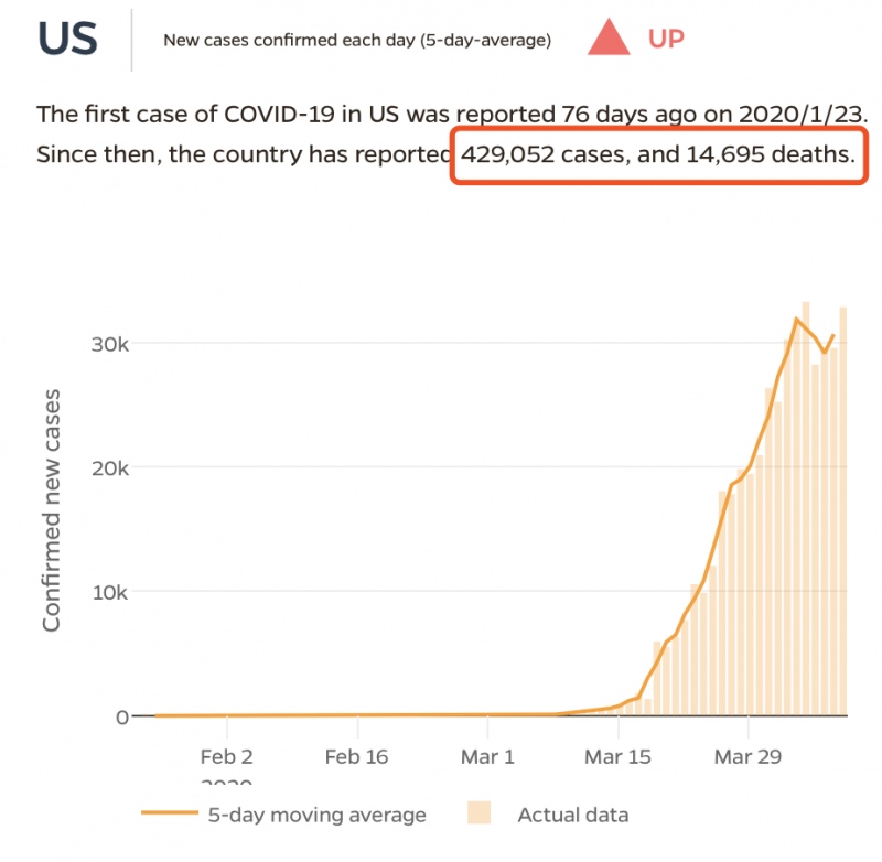 依据美国约翰斯·霍普金斯大学的计算多个方面数据显现,到北京时间9日10时30分,美国新冠肺炎确诊病例达429052例,逝世病例达14695例。与此一起,美国确诊病例增加的5日均线走势也开端滑润起来,但从近期新增病例来看,尚不能确认拐点现已到来。