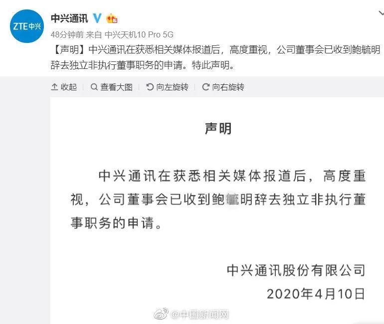 @中兴通讯 10日发布声明:在得悉相关新闻媒体报导后,分外的注重,公司董事会已收到鲍毓明辞去独立非履行董事职务的请求。特此声明。