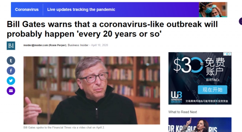 【环球网报导 记者 刘洋】据英国《金融时报》报导,微软创始人比尔盖茨正告说,新冠病毒是很多人一生中经历过的最大时刻,但人们现在现已意识到,未来,很可能这样的病毒大迸发每隔20年左右就会发作一次。