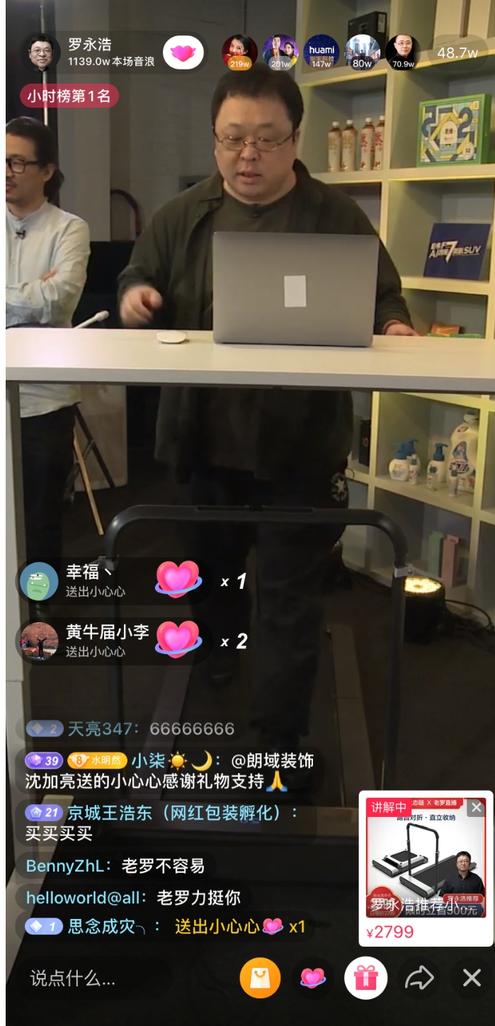 第2次抖音直播开端1小时20分后,在跑步机上一边体会产品,一边介绍产品功用的老罗总算找到了状况。他越走越快,渐渐跑起来了,一边气喘吁吁,一边不忘继续展现产品功用。