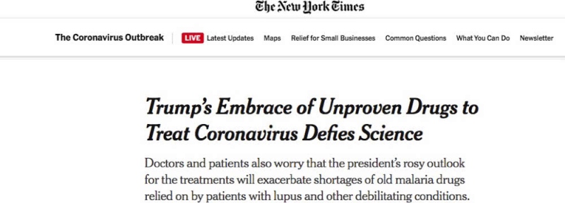 英国《金融时报》对此宣布评论称,特朗普执着于未经证明的新冠疗法是在冒险。文章指出,特朗普的做法只会导致美国政府疏忽对更可行的抗疫办法的重视。而那些真实需求羟基氯喹医治疟疾、狼疮和类风湿性关节炎的人也会因而缺少该类药物。