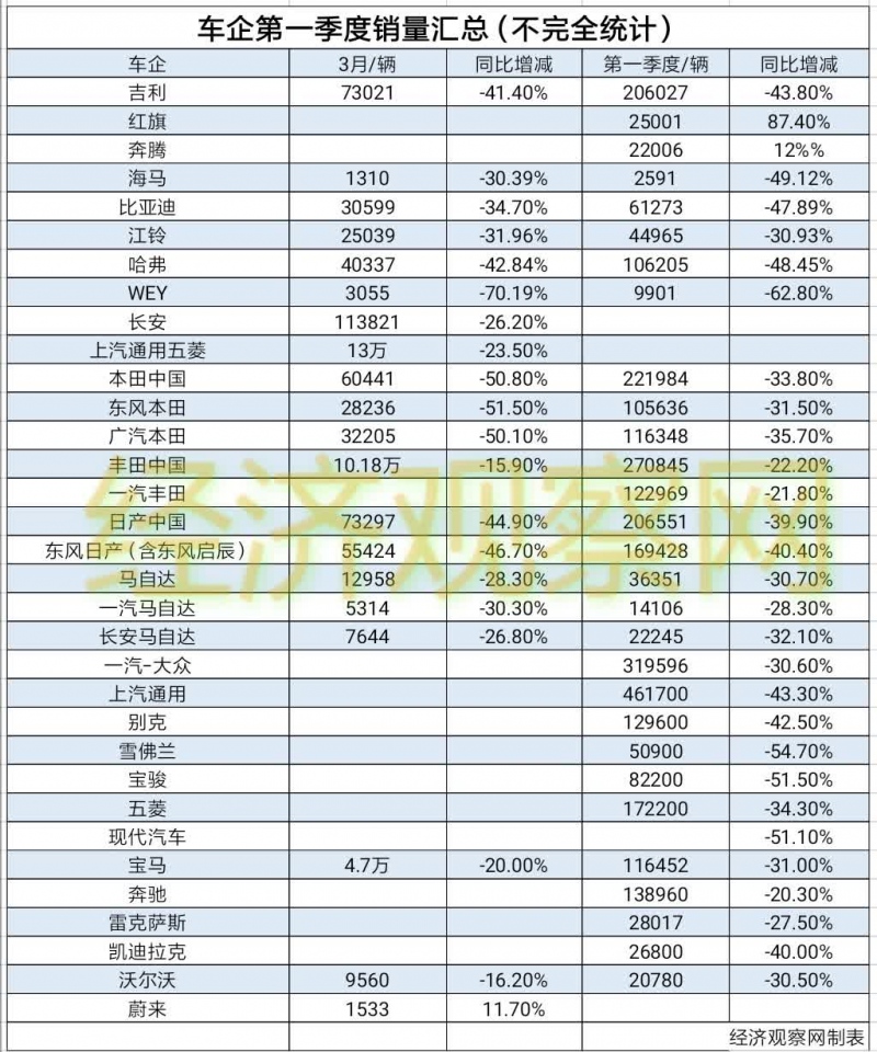 全体来看,榜首季度各品牌销量下滑起伏为30%-55%。日系车销量跌幅小于美系、韩系轿车企业,一汽-群众销量下滑30%左右,跌幅小于大都合资品牌,奢华品牌的商场体现也要好于干流合资品牌。吉祥、长城、比亚迪多个自主品牌的跌幅则超越40%,商场体现不及合资品牌,这与中汽协发布的数据相符。
