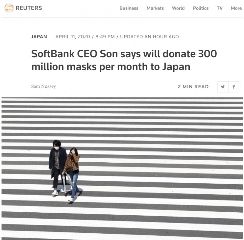 孙正义在推特上表明,软银将与日本政府的“口罩团队”协作,供给两种不同的口罩,优先用于医务人员,以处理因为新冠病毒爆发形成的口罩缺少。
