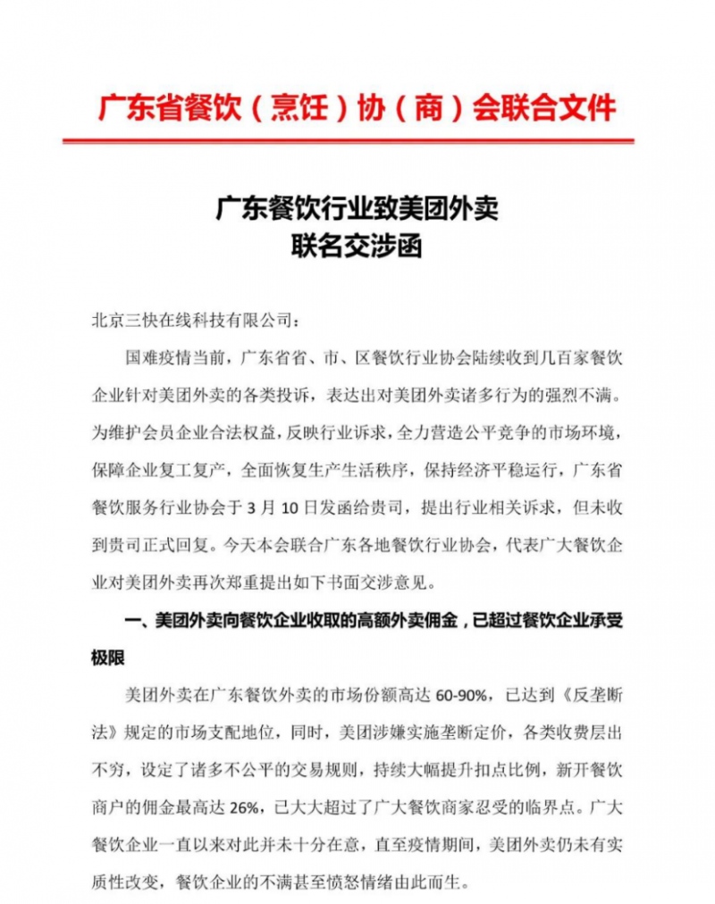 2020年4月10日下午,广东省餐饮协会在官方微信公众号上发布《广东餐饮行业致美团外卖联名交涉函》,表示美团外卖在举国抗击疫情期间,依旧坚持高额佣金以及排除公平竞争的独家条款,让众多餐饮商家不堪重负,餐饮协会在3月10日向美团发函后并未得到正式回复,不得已将此事公开化。