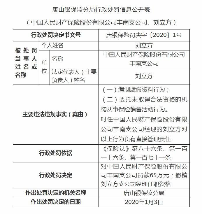 其间,唐银保监罚决字〔2020〕1号行政处分决议书显现,人保财险丰南支公司因编制虚伪材料、托付未获得合法资历的组织从事稳妥出售活动,被处以罚款65万元;时任司理刘立方对以上行为负有直接办理职责,被吊销任职资历。作出处分决议的日期为1月3日。