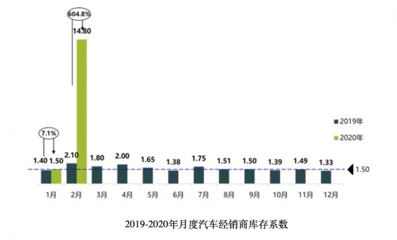 中国汽车流通协会多个方面数据显示,汽车经销商连续3个月库存预警指数位于荣枯线以上。尤其是在2020年2月份,汽车经销商综合库存系数达到14.8,同比上升6倍,环比上升8倍,创历史新高。有必要注意一下的是,2月份全国乘用车市场零售量仅为去年同期的20%,同比下滑达到80%。