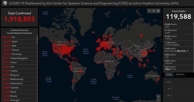 据美国约翰斯·霍普金斯大学实时计算多个方面数据显现,到北京时间9时左右,全球新冠肺炎确诊病例累计为1918855例,累计逝世119588例。