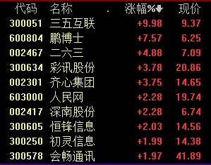 4月14日午后,云工作概念走强,到发稿,三五互联涨停,鹏博士、二六三、同心集团、深南股份等多股跟涨。