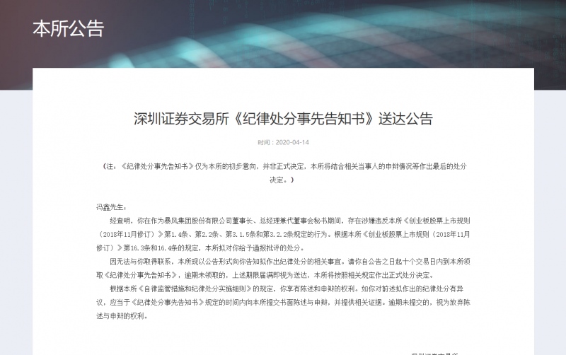 新京报讯 深圳证券买卖所官网今天发布《纪律处置事前奉告书》送达布告称,经查明,冯鑫在作为暴风集团股份有限公司董事长、总经理兼代董事会秘书期间,存在涉嫌违背本所《创业板股票上市规矩(2018年11月修订)》第1.4条、第2.2条、第3.1.5条和第3.2.2条规矩的行为。依据本所《创业板股票上市规矩(2018年11月修订)》第16.3条和16.4条的规矩,本所拟对其给予通报批评的处置。