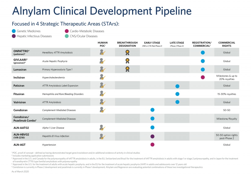 作为行业龙头,Alnylam的商业化进程较快,现已有几款产品登陆商场,包含RNAi医治产品ONPATTRO(patisiran),它现已在美国、欧盟、加拿大、日本和瑞士取得同意,它的上市曾掀开了小核酸药物的第二波热潮;以及在美国和欧盟获批的GIVLAARI(givosiran)。在研药物方面,Alnylam有六个候选产品现已走到了后期阶段。