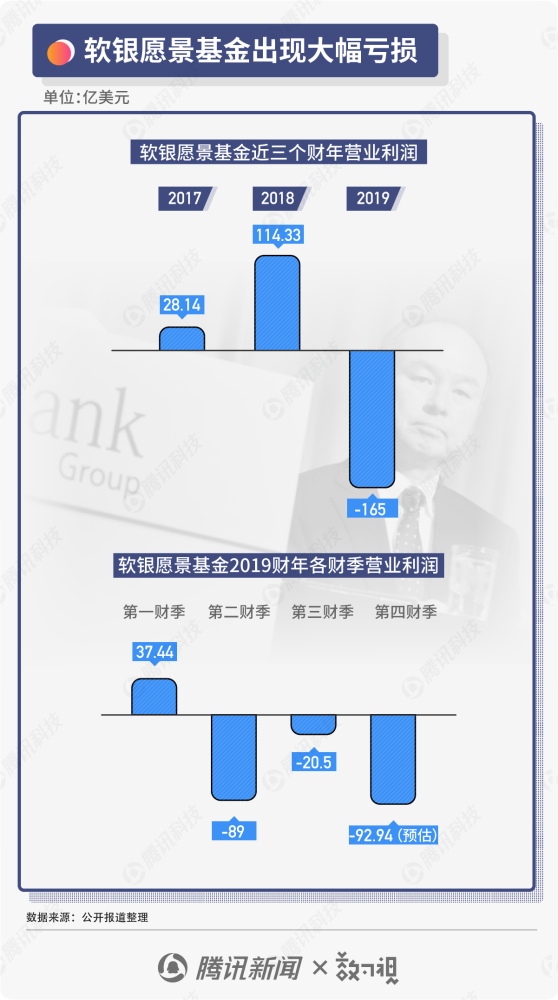 在愿景基金2019年财年里,除了榜首财季盈余之外,第二三四财季均在亏本。不过到2019年第三财季,愿景基金的报答仍然为正数,这也是为什么孙正义曾表明,虽然部分出资亏本,但少量成功的项目仍能让愿景基金盈余。可是孙正义的期待在第四财季大幅减值之后失败:当季愿景基金初次呈现超百亿美元的亏本。
