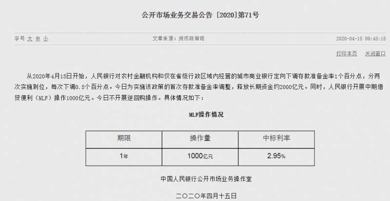 央行布告称,从2020年4月15日开端,人民银行对乡村金融机构和仅在省级行政区域内运营的城市商业银行定向下调存款准备金率1个百分点,分两次施行到位,每次下调0.5个百分点。今天为施行该方针的初次存款准备金率调整,开释长时间资金约2000亿元。一起,人民银行展开中期假贷便当(MLF)操作1000亿元。今天不展开逆回购操作。