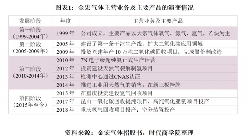 金宏气体的开展过程如图表1所示,1999—2004年,金宏气体刚成立不久,首要产品以大宗气体氧气、氮气、氩气、乙炔为主;2005—2009年,金宏气体逐渐出资建造了二氧化碳回收项目,并完结股份制变革;2010—2014年,针对电子半导体职业的商场需求,金宏气体开辟了超纯氨范畴,一起出资建造了工业用天然气项目;2015年今后,金宏气体在重庆的氢气回收项目、昆山的二氧化碳回收提纯项目连续投产,并进一步开辟了高纯氧化亚氮产品线。