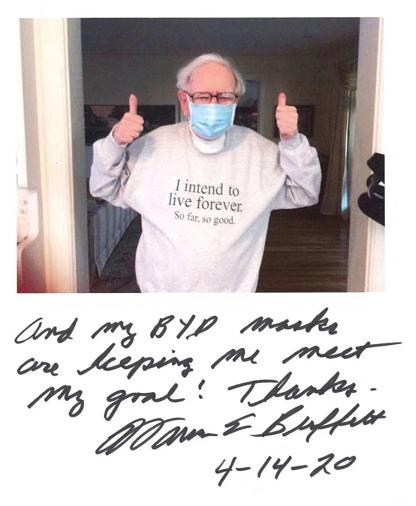 巴菲特称,“我的方针是天保九如,目前为止发展还不错。而现在,比亚迪口罩更是助我一臂之力!谢谢!”---沃伦·巴菲特,2020年4月14日