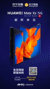 这个春天伊始,苏宁在线直播华为终“5G全场景”系列发布会,华为新一代折叠屏手机Mate Xs横空出世,首次进入大众视野。随后的时间里,这款更具革新的5G折叠屏手机,实力开启手机新形态革命:无论至臻设计、巅峰性能,还是革新体验,每一个单元仿佛都在为下一个手机时代重新定义经典。4月17日上午10:08,久未现身的Mate Xs将在苏宁金融APP任性付免息商城再度开抢,现已开启预约,抢到即赚到。