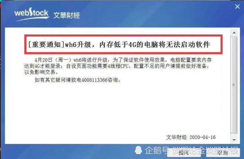 今天文华财经的一则晋级布告,让沉寂已久的文华工作,再度演出。文华财经,再度成为公敌,我们对它又爱又恨。不过这次的目标,更多的是普通用户,尤其是笔记本运用者。客户不得不晋级电脑装备,否则将无法发动软件。