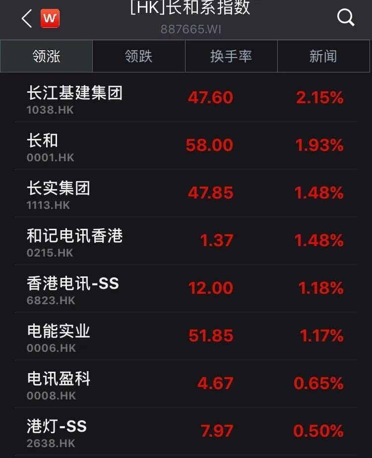 详细来看,长江基建集团、长和涨超2%,长实集团、和记电讯、香港电讯、电能实业等均团体上涨。