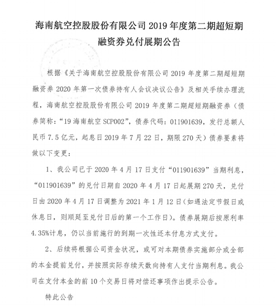 4月17日,海南航空控股股份有限公司公告称,“19海南航空SCP002”已付出当期利息,本期债券兑付日期自4月17日起展期270天,兑付日调整为2021年1月12日。
