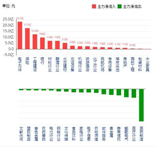 主力资金净流入最多的板块为电子元件、稳妥、工程建造、银行和资料职业。