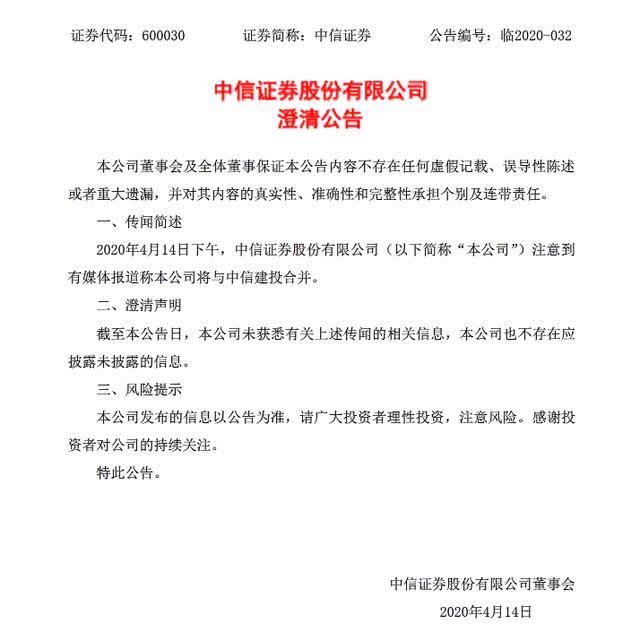 4月14日晚间,中信证券和中信建投快速发表布告,否定商场上风闻的兼并事情,一起两家公司均称不存在应发表未发表信息。