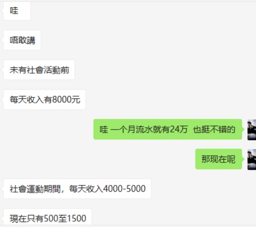 香港一家运营餐饮店的老板向记者称,“正常期间咱们店每天营业额有8000港元左右,现在每天营业额只要500-1500港元左右,每天店租1000港元,假如再持续这样,我连店租都交不起了。”