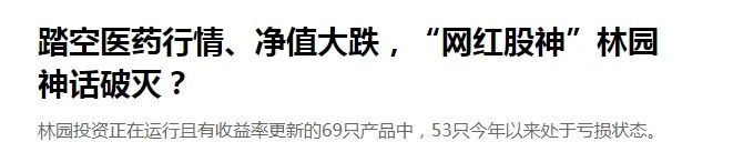 4月10日有媒体刊发稿件质疑,林园出资正在运转且有收益率更新的69只产品中,53只本年以来处于亏本状况。并因而质疑“网红股神”林园的出资神话是否将就此幻灭?