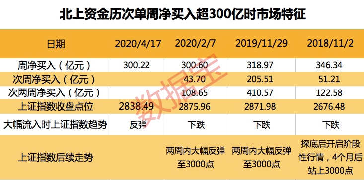 本周北上资金净买入A股300.22亿元,单周净买入金额史上第四次打破300亿元大关,前三次别离发作在2018年11月,2019年11月和本年2月。证券时报·数据宝计算发现,北上资金四次大举流入前后商场呈现出了一些类似特征。