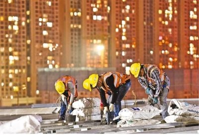 近来,在广西柳州柳东新区世界会展中心三期项目工地,夜班工人在屋面作业。 黎寒池摄(印象我国)制图:蔡华伟