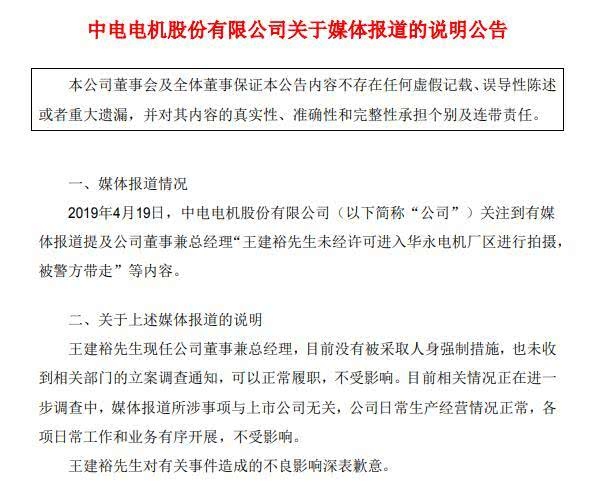 中新经纬客户端4月19日电 针对新闻媒体报导中电电机董事兼总经理王建裕“未经许可进入华永电机厂区进行拍照,被警方带走”等内容,中电电机19日晚布告称,王建裕现在没有被采纳人身强制措施,能够正常履职。