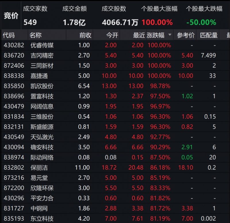 4月20日,新三板竞价买卖的个股中,超20只个股涨幅超50%,其间优睿传媒、嘉捷通、吉冈精细、三同新材等个股单日涨幅超100%。