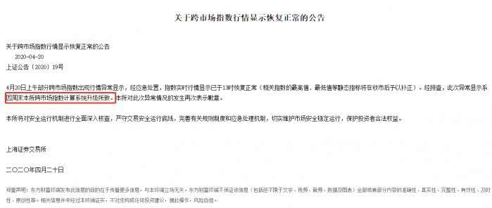 12时21分,上交所再次发布布告,就部分跨商场指数呈现行情显现反常情况表达抱歉,指出发现反常情况后,上交所当即发动应急处置预案,会同中证指数有限公司查找反常原因,将尽快于日内康复相关指数行情的正常显现。一起,对全商场买卖继续进行监控排摸,力保商场正常买卖。