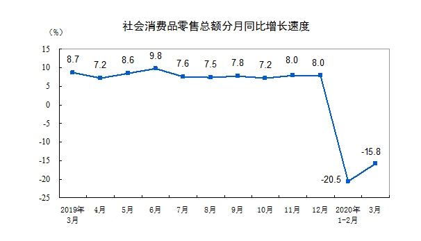 国家统计局数据显示,一季度,社会消费品零售总额达78580亿元,同比名义下降19%。从消费类型看,餐饮收入下降44.3%,商品零售下降15.8%,全国网上零售额下降0.8%。