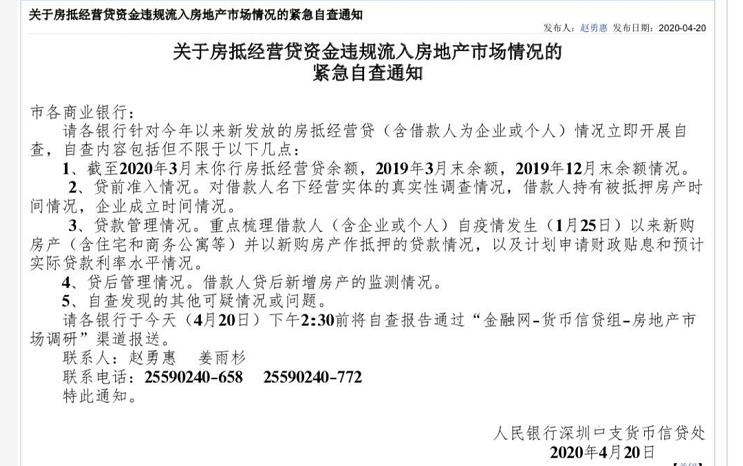 4月20日,针对近期房抵运营贷资金违规流入房地产商场的状况,中国人民银行深圳中支钱银信贷处向辖区内各商业银行下发紧迫自查告诉,要求各银行针对今年以来新发放的房抵运营贷(含告贷人为企业或个人)状况当即展开自查。