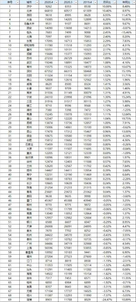 北方城市楼市回暖,涨幅前10 的城市中,共有8个北方的城市,分别为:济宁、北京、洛阳、大连、乌鲁木齐、西安、包头、呼和浩特。