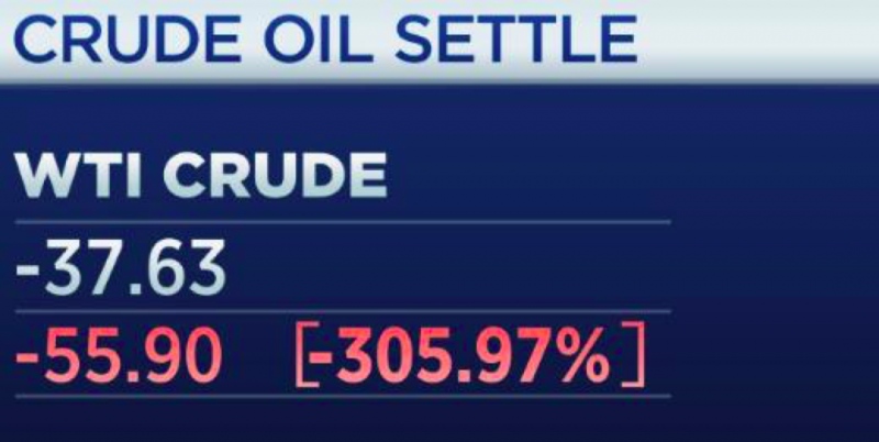 油价完全崩了!周一美国WTI原油期货5月合约价格开盘后一路跳水,到美东时刻2:30收盘,终究跌落305.97%,收报-37.63美元/桶,史上初次收于负值。这在某种程度上预示着出资者进行WTI原油什物交割将收到现金,油运和存储成本已超越了石油自身的价值百科。
