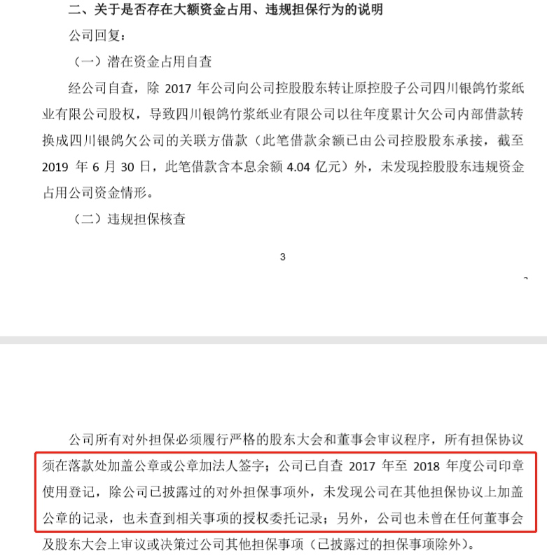 2019年12月7日,银鸽投资再次发布澄清公告表示已自查2017年至2018年度记录,除已披露过的对外担保事项外,未发现在其他担保协议上加盖公章的记录,也未查到相关事项的授权委托记录。