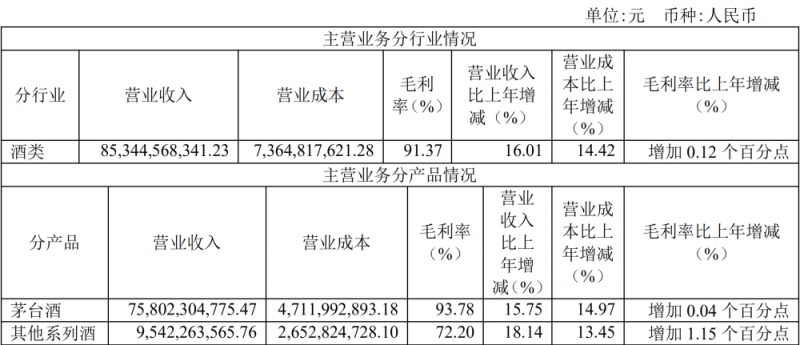 上一年,茅台酒和系列酒毛利率也双双呈现上升。其间,茅台酒的毛利率为93.78%,同比添加0.04个百分点;系列酒的毛利率为72.2%,同比添加1.15个百分点。由此,贵州茅台全体酒类事务全体毛利率为91.37%,同比添加了0.12个百分点。