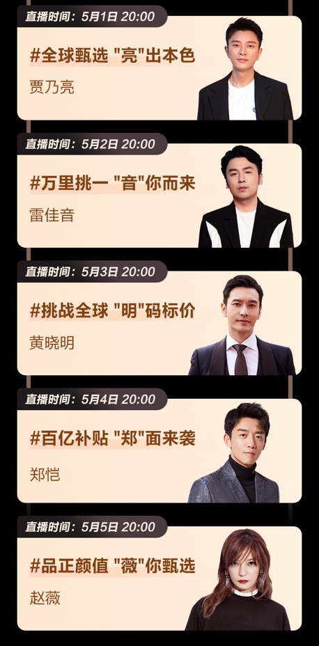 从5月1日到5月5日,接连五天,每晚八点,五位新官宣的代言人将顺次在万里意图抖音直播间中呈现。据泄漏,这场直播系列活动在抖音内部也取得了分外的注重。