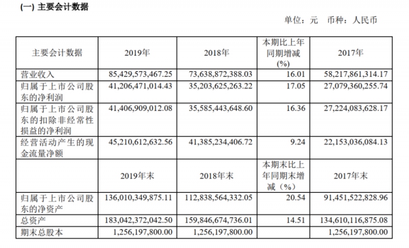 4月21日晚间,贵州茅台(600519.sh)发布2019年度报告,依据茅台年报,2019年,茅台完结营收854.3亿元,同比增加16.01%,完结净利润412.06亿元,同比增加17.05%。2020年的方针是同比增加10%,即完结营收940亿元。