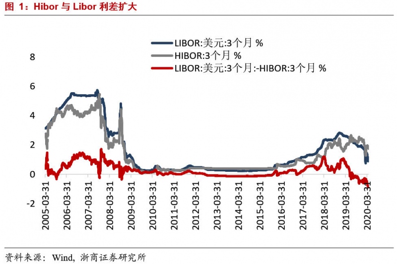 近期港币兑美元走强,4月21日触发联系汇率机制下7.75港元兑1美元的强方兑换保证,这是2015年10月后,强方兑换保证首次被触发。当日香港金管局从市场买入美元、沽出总值15.5亿的港元维稳汇率。我们大家都认为港币走强根本原因是市场套息活动及股票投资相关的港元需求均有所增加,除此之外,财政开支增加亦会令港元需求上升。其中最为核心的是香港与美国市场利率利差扩大使得套息活动升温。3月15日联储大幅降息100BP将联邦基金利率目标区间降至0-0.25%,同时推出包括7000亿美元QE、降低贴现窗口利率等多项货币政策工具,3月23日进一步宣布无限量宽松措施。香港于3月16日跟随美联储下调基本利率至0.86%,该利率尚未触及零下限,且美联储后续宽松节奏香港并未全部跟进,这使得两个经济体市场利率利差扩大,自3月15日美联储降息,3个月期Hibor与Libor利差已经由+43BP升至+90BP,套利空间加大,使得港币自3月底出现升值压力。近期港币走势与2018年港币贬值触及弱方保证线的情况是相互映射,核心原因都是利差带来的套利行为。