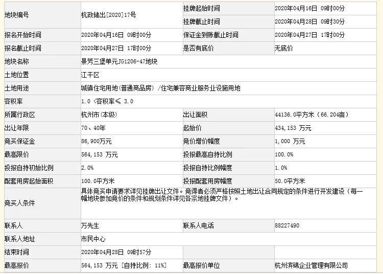 其间,江干区编号为杭政储出[2020]17号的地块被滨江集团(002244.SZ)的子公司杭州滨锦企业管理有限公司以56.41亿元拿下,自我克制份额11%,折合楼面价42607元/平方米,溢价率29.94%。