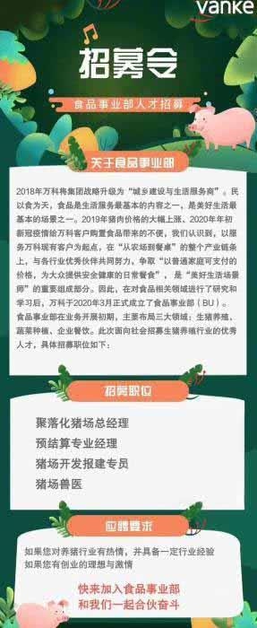 招聘概况显现,与养猪相关的职位从属万科的食物事业部。这个部分建立于2020年3月,事务展开初期首要布局三大范畴:生猪饲养、蔬菜栽培、企业餐饮。