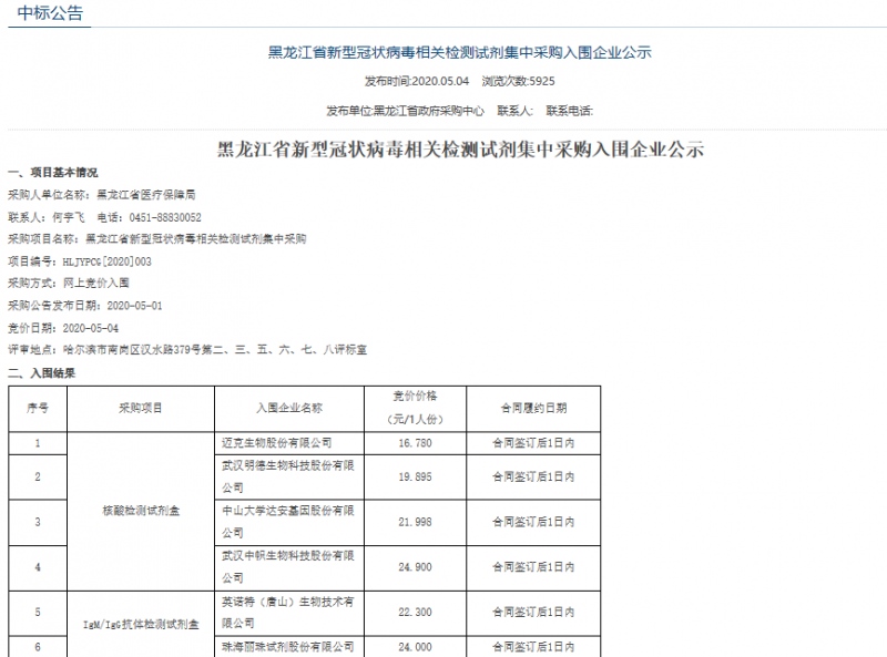 渐渐的开端政府会集收购病毒检测试剂的还有黑龙江和福建省、贵州省。5月4日,黑龙江公示新式冠状病毒相关检测试剂会集收购入围企业名单,迈克生物、明德生物、达安基因、中帜生物(新三板挂牌企业),丽珠试剂、英诺特(唐山)6家公司入围,竞价价格也在16.78元/1人份到24.9元/1人份不等。