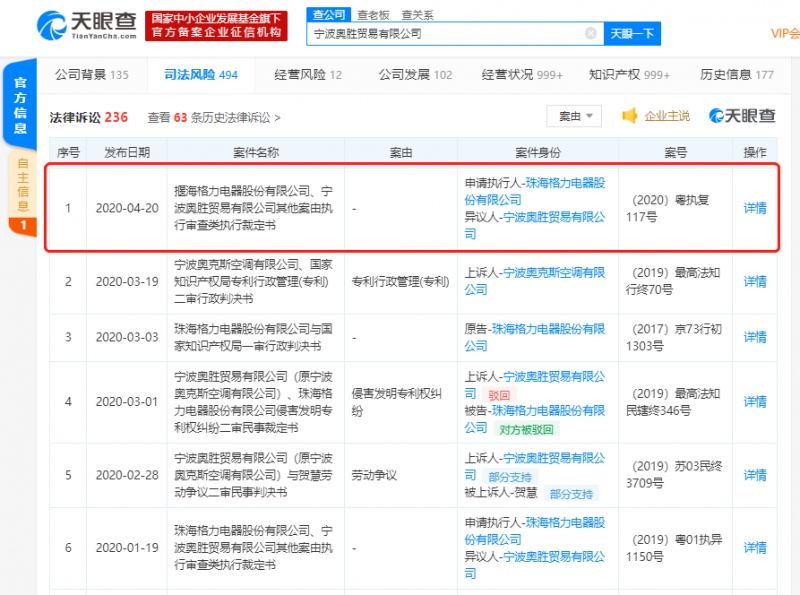 天眼查多个方面数据显现,在我国裁判文书网4月20日发布的履行裁决书中,广东省高级人民法院以为,本案中,复议恳求人奥盛公司提出的复议理由有两个:一是案子已确认进入再审程序,且有或许改判。二是该专利不稳定,且格力回绝合作履行反转。复议理由一本质是对本案的履行根据不服,该理由不属履行贰言复议检查的规模。本案履行根据即收效判定未经法定程序吊销、改变或中止履行前,广州中院履行本案判定并无违法不当之处。奥盛公司以“该专利不稳定,且格力回绝合作履行反转”为由建议中止履行本案,理由亦不建立,本院不予支撑。