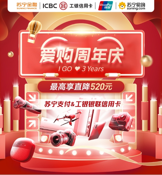 5月18日至5月20日,用户在苏宁易购线上商城购买家电3C类自营商品(特例商品不参加,以收银台优惠展示为准),通过苏宁支付使用工银银联信用卡(62开头)快捷支付,享每千减百最高减300元优惠。