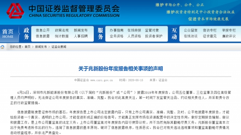 5月15日晚间,证监会宣布《关于兆新股份年度陈述相关事项的声明》,证监会对此高度注重,第一时间下发监管注重函、约谈相关责任人,并采纳责令改正的行政监管办法。
